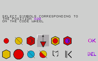 This game uses a code wheel for copy protection. There is only one code wheel and it works for all versions of the game. You may enter the symbols in any order, but you must successfully pass the code wheel protection twice to play the game. If you fail the protection on the Amiga or ST, the game will hang.