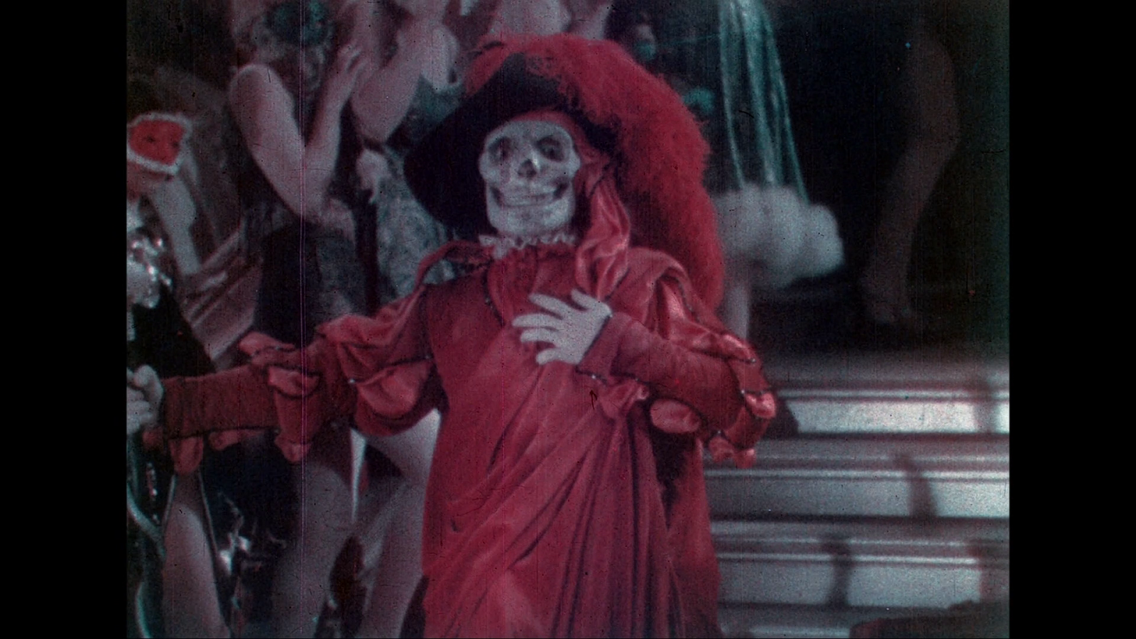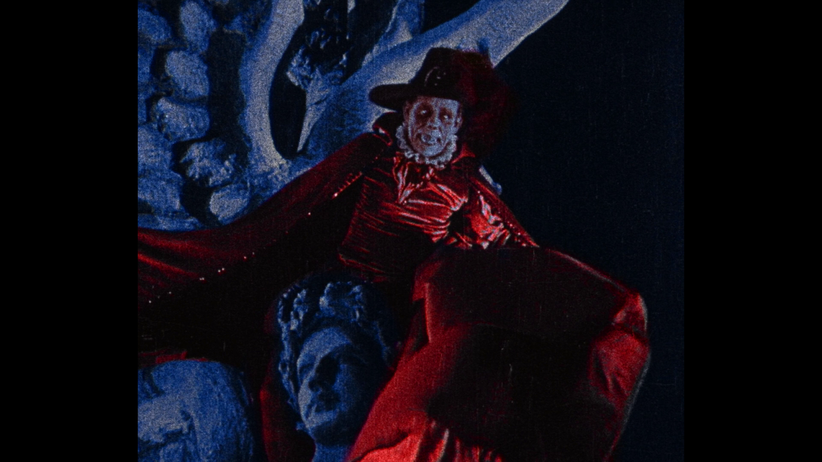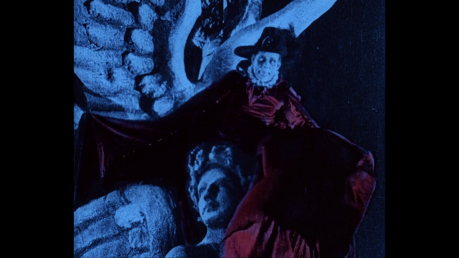 Image Laserdisc, DVD and Blu-ray have no Technicolor footage after the scene on the roof of the opera. The footage is tinted. Milestone and BFI has colorized all the footage of the Bal Masque occuring after the scene. Image Blu-ray recreated the Handschiegl process for the face of the Rat catcher and to visualize the heat in the torture chamber. While I was previously aware of the possibility of some Handschiegl work for the rat catcher's scarf, I was not aware that there was the possibility of the Handschiegl process being used for his face or the torture chamber. Both recreate the process for the Phantom's costume when he is on the roof, but the result is noticeably different.