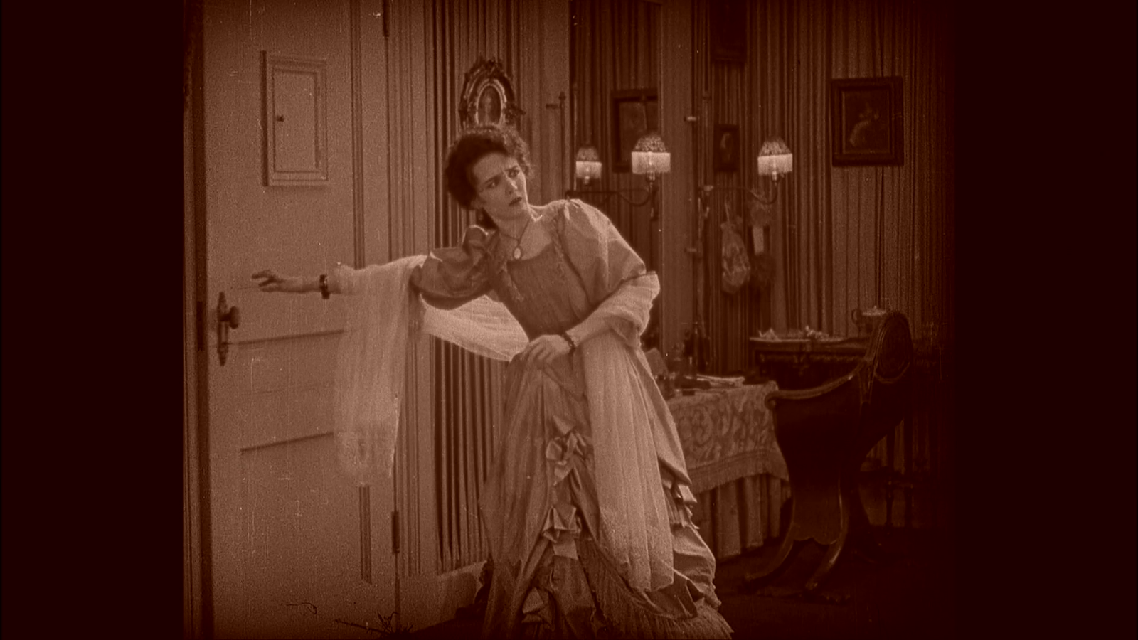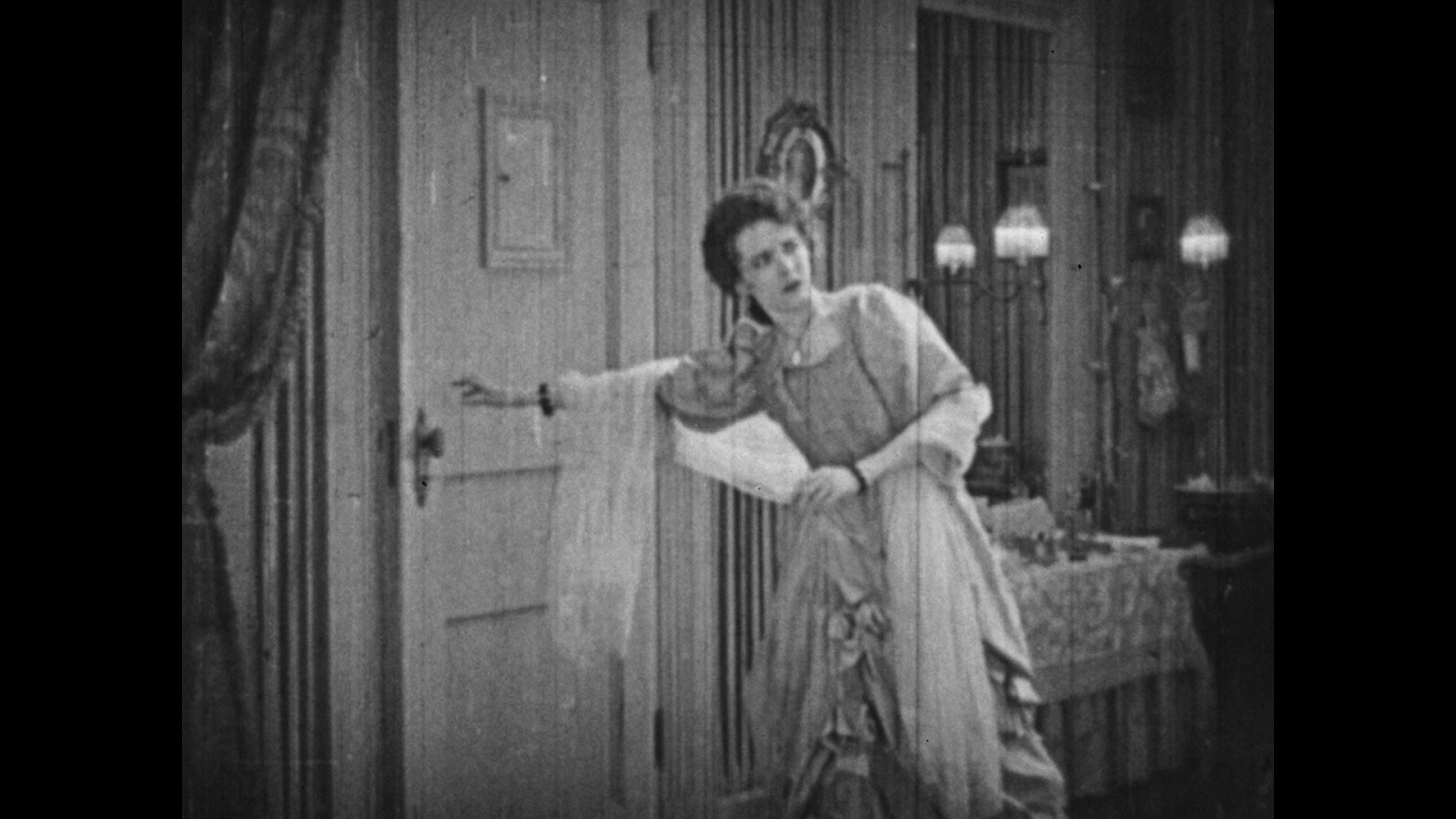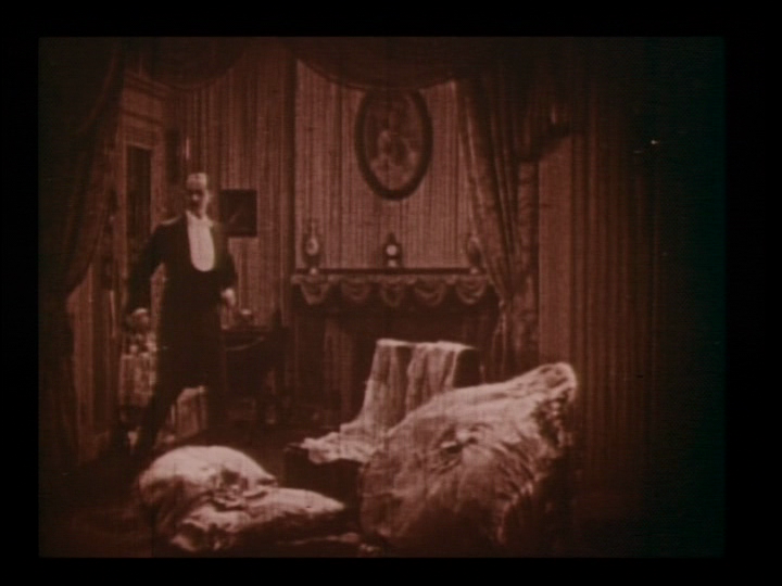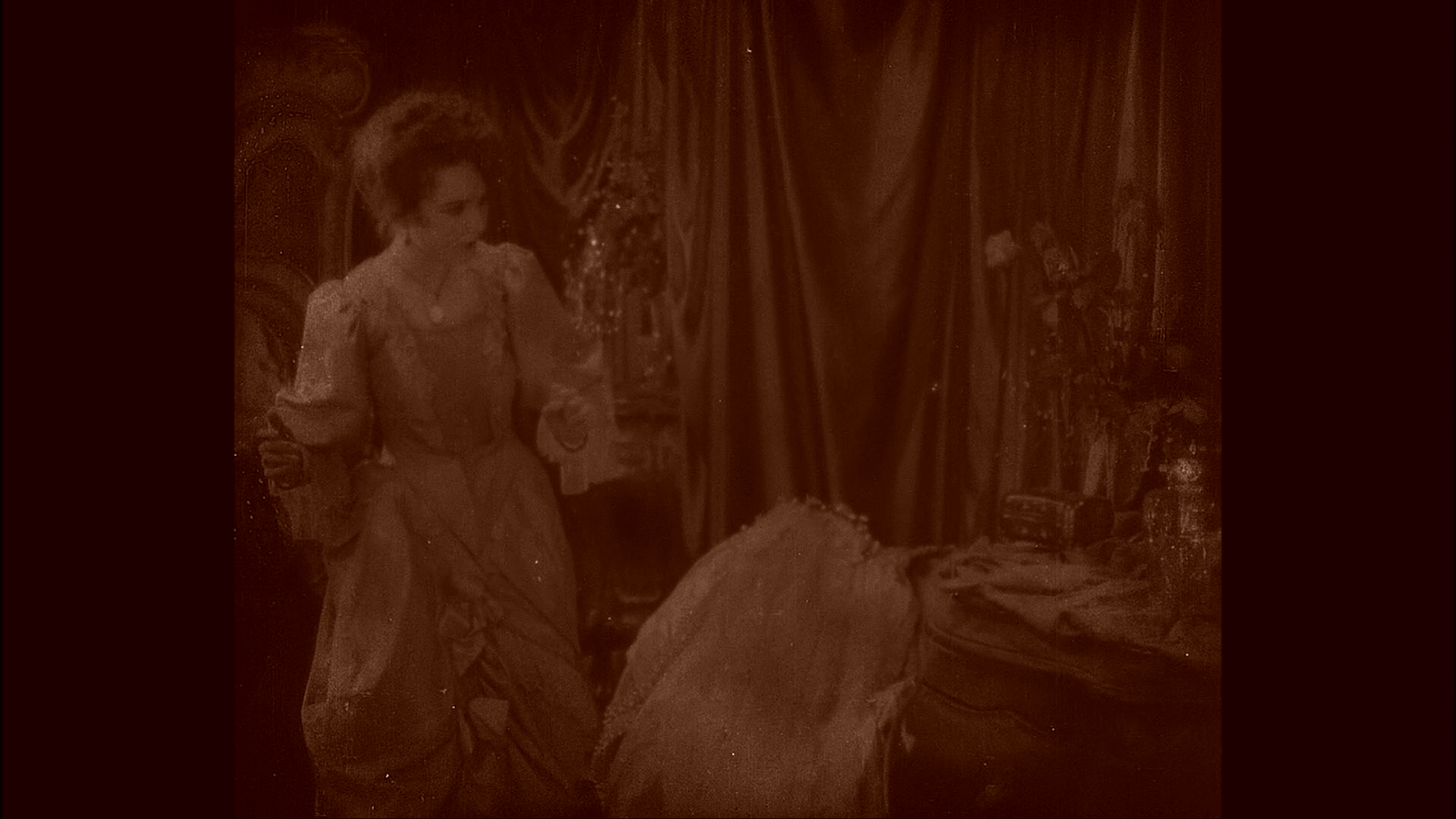 Scene 8 - Christine's Dressing Room: The Master's servant tells Christine to come through the mirror. The film for this scene has been mostly recovered.