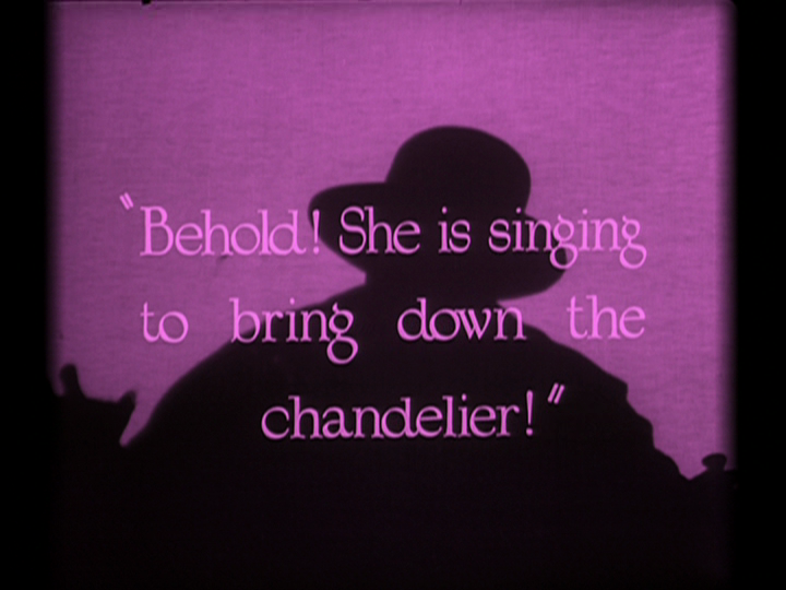 Brownlow is more consistent with its tinting than Shepard. All outside evening scenes are blue and all opera cellar scenes are purple with only one exception for each. Indoor scenes are sepia with the exception of the ballet and the phantom's lair. Beginning credits and end title are blue. The green in the Phantom's Lair scenes is so light as to easily confuse it for not being colorized at all. Apparently the different tints in the rooftop scene may have been original to the print, as it is the only scene where the intertitles are a different color than the action and all the speakers are in the same room (contrast to Christine and the Phantom talking to her behind the mirror when she is in her room).