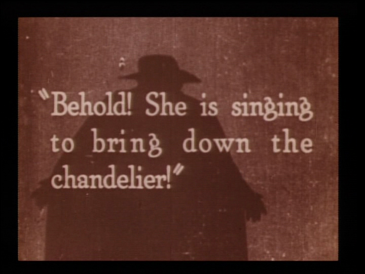 There is a frame rate issue inherent in the Eastman Print. The vast majority of the footage was shot in 1925 at silent speed. This should be projected correctly at 20fps. The footage shot in 1929 would have been shot in sound speed. This means that the Opening Titles (where the phantom is skulking in the frame), The Man with a Lantern scene and the shots of Mary Fabian as Carlotta singing should be ideally projected at 24fps (especially for the latter if it is to be synchronized to the existing audio. The shots where Christine is singing just before she is abducted by the Phantom may also be from 1929. The BFI handles this by running these sequences at a true 24 frames per second while running the rest of the film at 20 frames per second.
