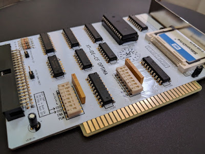 Turning to the PC compatible market, XT-IDE cards are always in demand. However, supplies tend to be a bit unstable. One of the most recent products looks like a very good one, it is called the XT-IDE-CF Optima. This card has the benefit of a full XT-IDE implementation in that it can accept regular 16-bit hard disk drives and break down the 16-bit data from the drive into two 8-bit data reads and vice versa to a CPU which only has an 8-bit bus available. In addition to a standard 40-pin IDE connector, it also has a CF card connector for easy data transfers. CF cards are IDE compatible and have an 8-bit transfer mode, all that is required is for that mode to be unlocked by the XT-IDE BIOS.