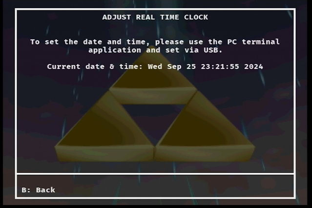 Pressing the Start button anywhere in the menu will bring up five settings options. Edit settings will show you the settings in the menu\config.ini file but to change those settings you must edit the .ini file with a text editor. Show system info will show you the cartridge's date and time, whether an Expansion, Controller or Rumble Pak is detected and which Joypads are detected. Show credits will show you the menu software version and its author and licensing information. Adjust RTC tells you to use the terminal program to adjust it and Show cart info does not show anything at this time.